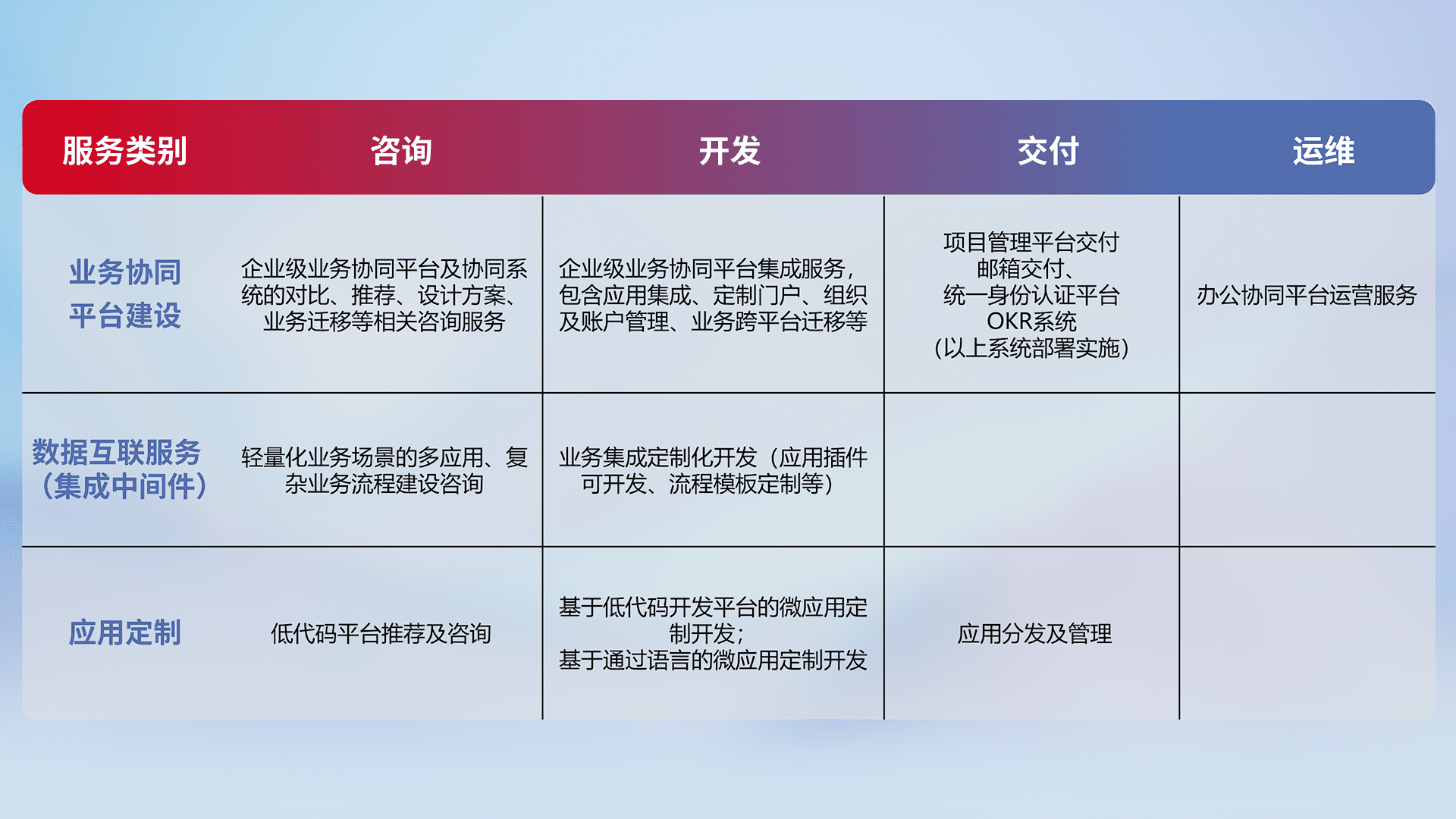 针对钉钉、、、企微、、、、IDaas等平台级产品提供产品的规划、、、方案、、、、交付、、、、定制化开发等服务,,,,实现如统一协同办公、、智能客户服务、、、、混合会议管理、、、、智能数据查询、、、等业务场景,,实现数字化转型。。。。