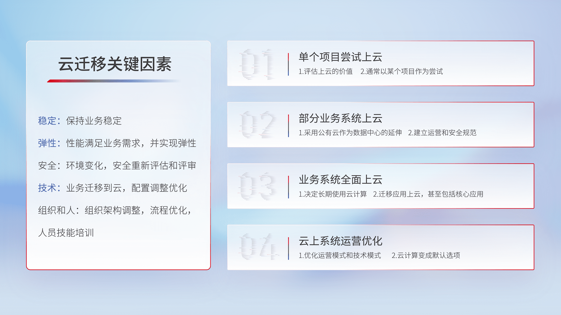 结合实际业务,,,,从规划设计、、云平台选型、、、、云原生改造、、数据迁移、、、、集成交付,,,,迁移全过程为客户识别最佳上云路径,,做好风险识别管理,,,,设计网络架构、、、身份权限、、、安全审计合规、、操作审计、、、、日志审计、、、、监控告警策略、、多站点容灾设计等,,,,对云上基础设施进行整体规划,,,提升IT治理水平,,,以满足弹性、、、高可用、、、、高性能的需求。。