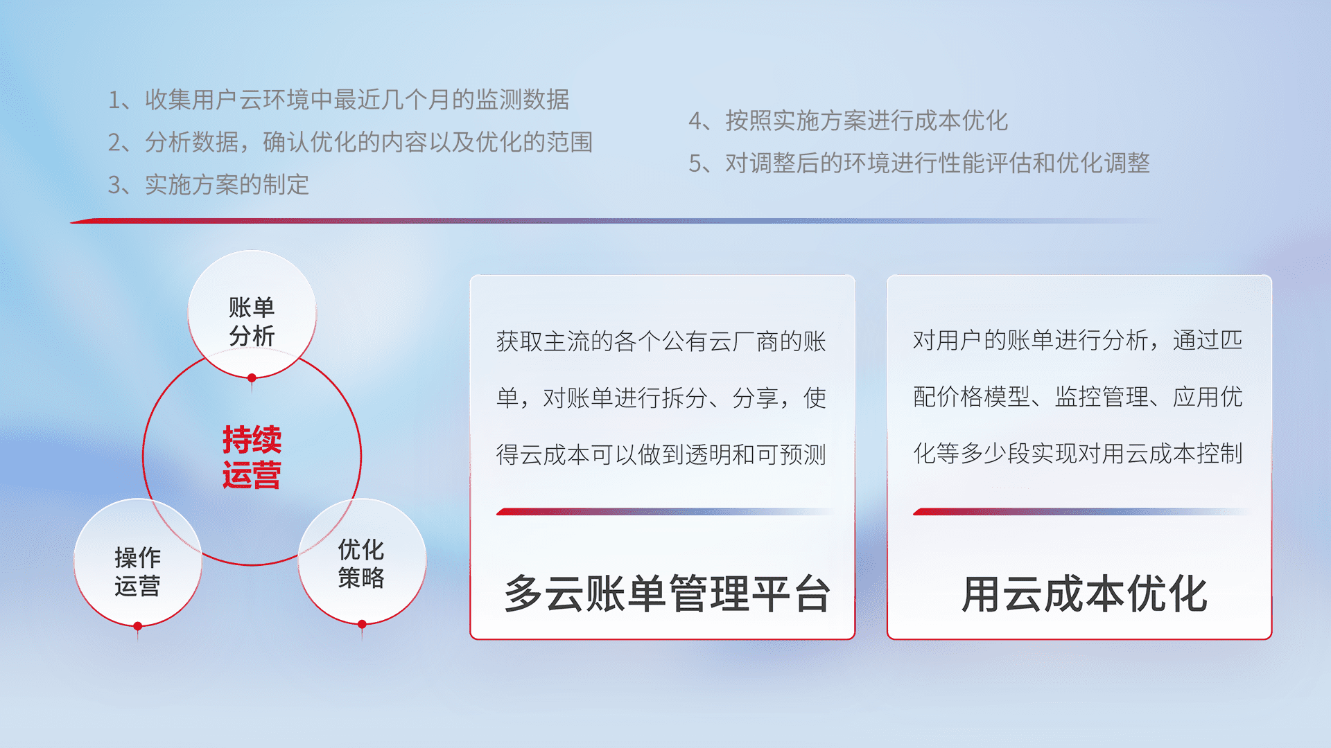 通过多云纳管,,以统一的资源数据模型把客户的云资源进行抽象和封装,,,进而实现对多云资源的统一操作,,保障云资源管理的可靠性、、稳定性与可用性。。量身定制化运维内容,,,,配置、、开发运维、、、补丁管理、、、备份、、、、监控、、、、认证和访问管理、、审计和日常巡检等,,,保障在用云过程中的可靠度,,稳定度以及高可用率。。